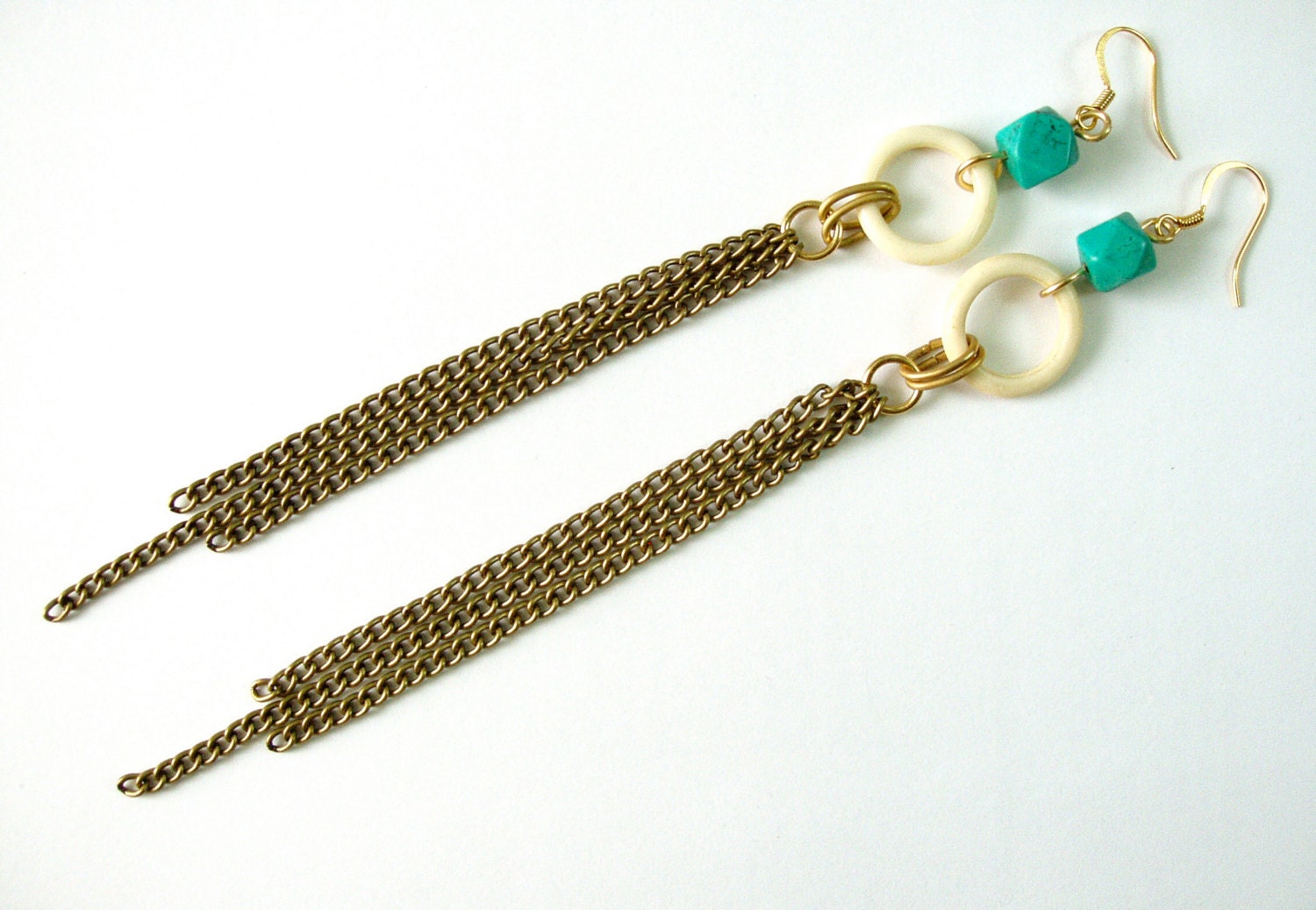 Antique bronze chain tassels descend from gold tone rings and circle carved from bone. Accented by a caribbean green turquoise bead, these beauties hang at a stunning 6.5 inches in length from ear wire to end of longest chain.